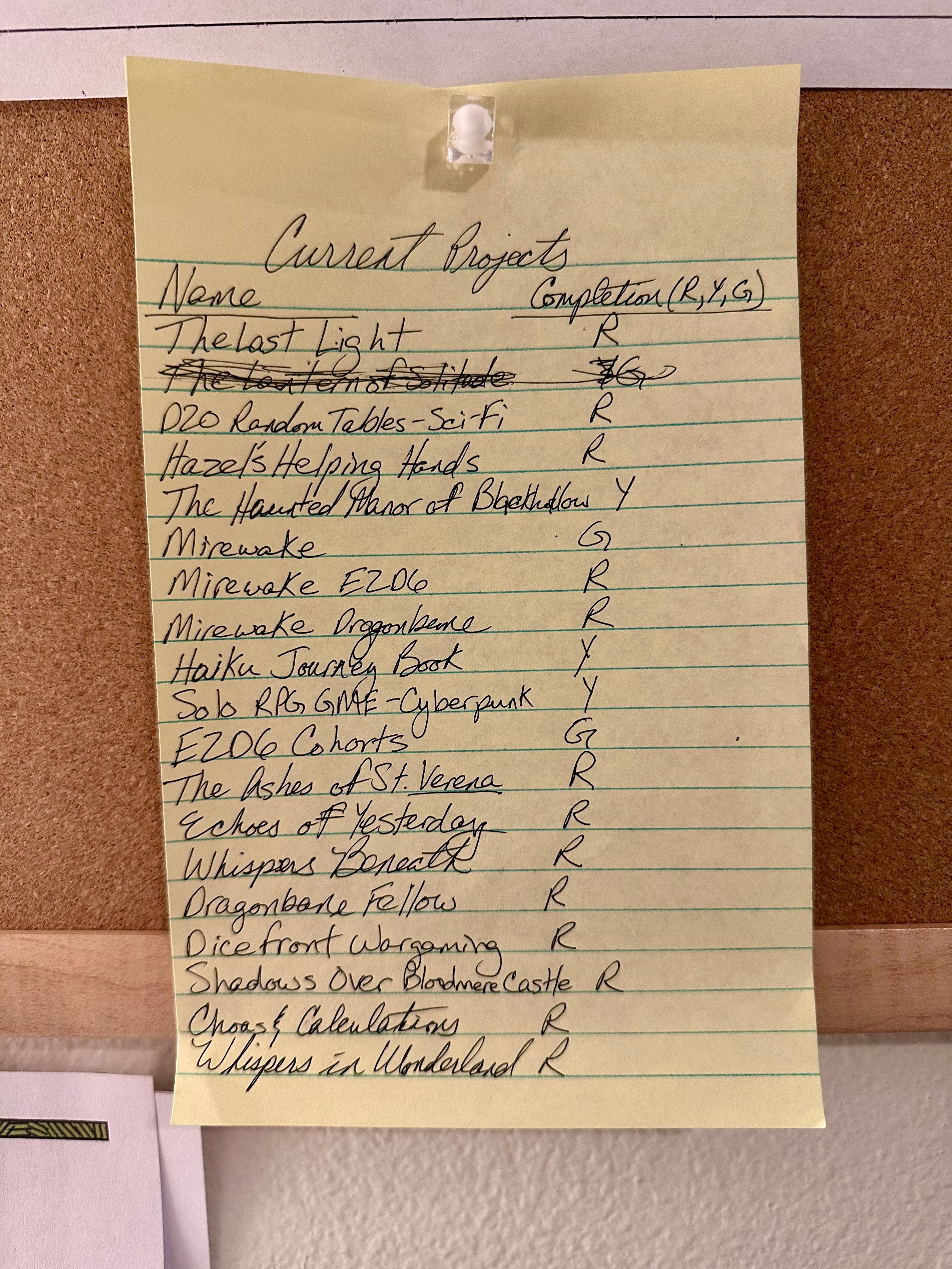 The yellow note on my cork board consists of the current ideas I have for upcoming projects. Some are merely notes, some have many journal entries in my journals, and some are completed.